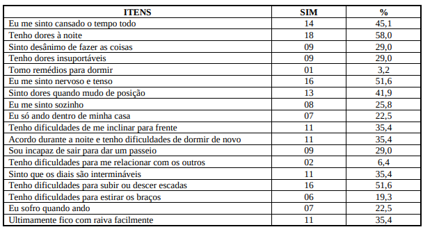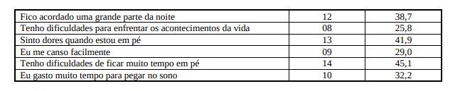 Com relação aos sintomas de fadiga, na amostra de 31 sujeitos entrevistados, os mais freqüentes se manifestam como nervosismo e tensão, 51,6% dos entrevistados, ficar com raiva facilmente, 35,4%, dores noturnas, 58%, sentimento de solidão, 25,8%, desânimo para dar um passeio, 29%. A tabela 03 resume estes dados.