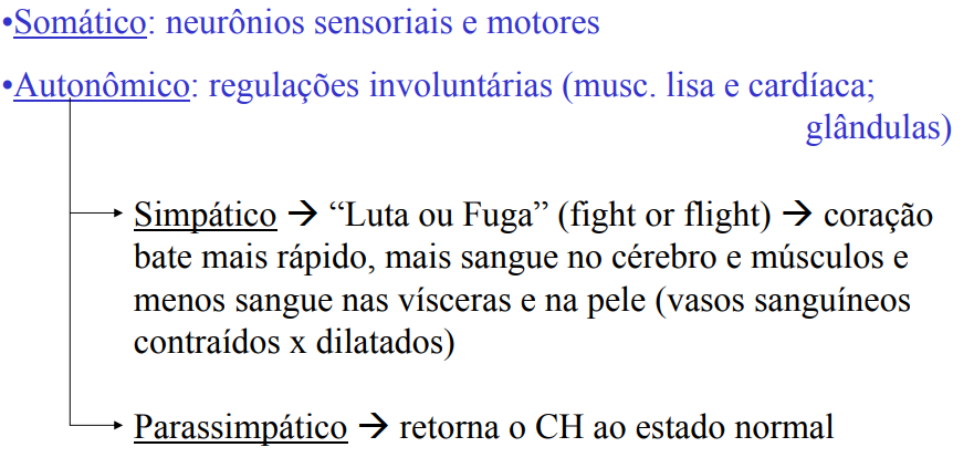 - Nervoso (cérebro, coluna cervical, nervos periféricos e órgãos sensoriais): regula as atividades do CH através da detecção e resposta a estímulos internos e externos;