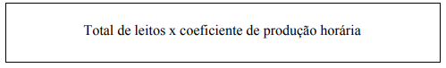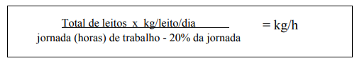 Para o cálculo do peso de roupa por hora de trabalho, utiliza-se a fórmula a seguir, com a redução de 20% na jornada de trabalho, considerando-se a quebra da eficiência real do servidor, por interrupções inevitáveis: