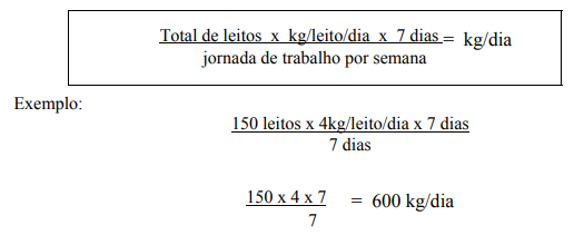 Num hospital em que há troca diária de roupa dos leitos de pacientes e acompanhantes e que lave os uniformes dos funcionários, o índice fica entre 7 a 8 kg/leito/dia, que é o atualmente usado nos Estados Unidos da América, em hospitais de alto nível de atendimento. Para se calcular o peso de roupa a ser processada por dia, utiliza-se a seguinte fórmula:
