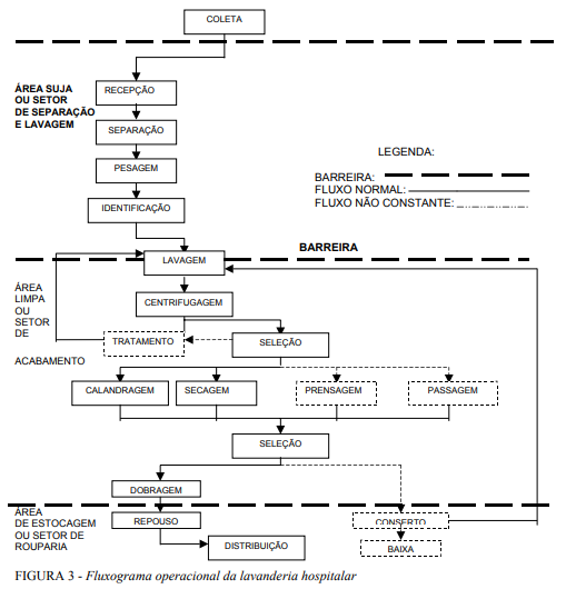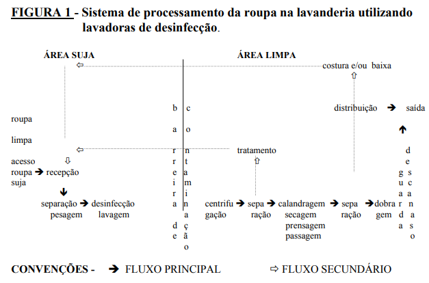 É de fundamental importância um estudo cuidadoso do fluxo da roupa, não devendo ocorrer cruzamento entre a roupa suja e a roupa limpa, visando evitar contaminação. Um fluxo bem estudado racionaliza tempo, equipamento, pessoal e área de circulação, propiciando à lavanderia uma melhor funcionalidade.