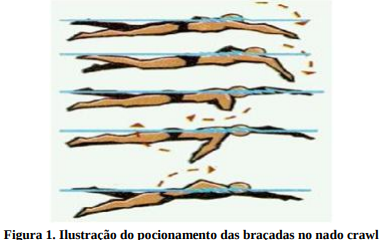 A braçada se divide em duas fase: a) fase sub-aquática (entrada, apoio, tração ou empurrada, e finalização); e b) fase aérea (recuperação). Dentre essas etapas, vários movimentos são realizados em sequência, como mostra a Figura 1, adiante.
