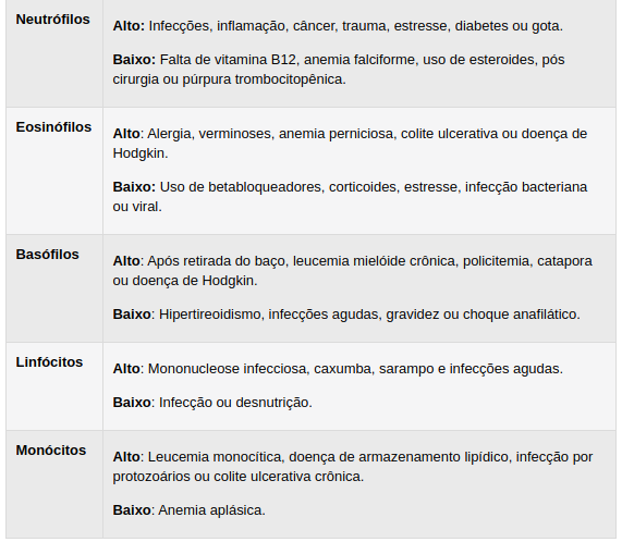 - Já a presença exagerada de leucócitos confirma infecções bacterianas. A alta concentração de outras células de defesa, como os eosinófilos, sugere alergias ou presença de parasitas no intestino. Os bastonetes, por sua vez, aumentam quando o corpo não está dando conta de combater a infecção, o que pode significar uma maior severidade do quadro.