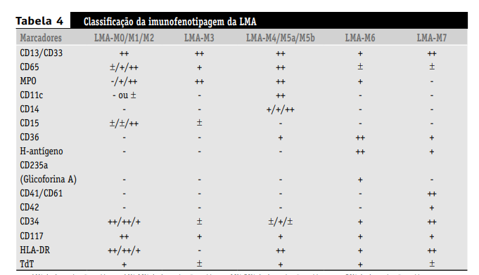 A citometria de fluxo é realizada com maior freqüência para distinção entre as leucemias mielóide e linfóide, o que é de crucial importância, e na monitorização pós-tratamento da LMA para detecção de doença residual mínima(45, 49, 54, 57). Também é útil na correta identificação dos subtipos de LMA, como a LMA M0, e na diferenciação da leucemia promielocítica aguda (M3) da LMA M1/M2(8, 27).Geralmente, a imunofenotipagem é realizada em suspensões de células do sangue periférico e da medula óssea, mas, quando necessário, pode ser feita em cortes histológicos. A Tabela 4 resume os principais marcadores imunofenotípicos relacionados aos subtipos de LMA.