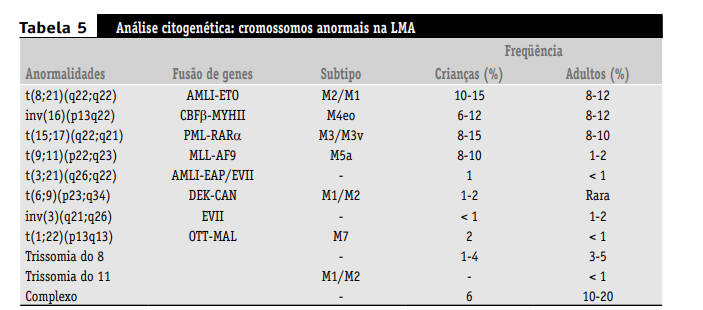 A importância da citogenética e da genética molecular na LMA para classificação e para compreensão de mecanismos patogênicos é apreciada cada vez mais no contexto clínico. As aberrações citogenéticas mais comuns observadas na LMA, e suas frequências, estão listadas na Tabela 5.