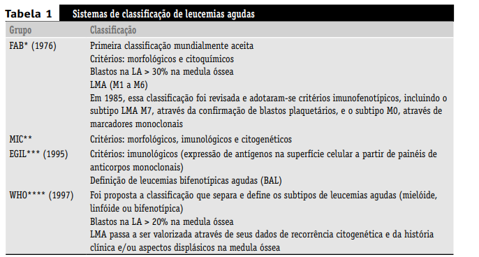 Os primeiros sistemas de classificação das LA eram baseados somente em investigações citomorfológicas e citoquímicas. A morfologia ainda representa um modelo central, mas foi incorporada em sistemas de classificações atuais, como imunofenotipagem para um delineamento mais preciso da linhagem hematopoética, e estágio de diferenciação de leucemias em particular. Na Tabela 1 são abordadas as principais classificações das leucemias agudas.