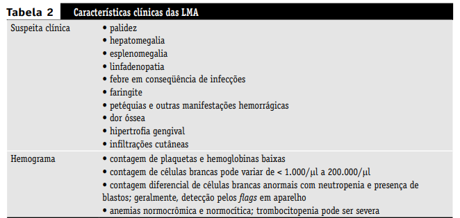 Geralmente, o diagnóstico de LMA inicia-se a partir de uma suspeita clínica (Tabela 2) e se baseia na avaliação do sangue periférico e da medula óssea(4, 23, 35). Embora a morfologia continue sendo o fundamento para o diagnóstico, técnicas adicionais, incluindo imunofenotipagem, avaliação citogenética e estudos de genética molecular, tornaram-se essenciais e, em alguns casos específicos, são ferramentas complementares obrigatórias(49, 51). O uso de procedimentos diagnósticos permite a identificação do tipo celular envolvido na leucemogênese, o que é fundamental para orientar a terapêutica e determinar, até certo ponto, o prognóstico das leucemia.