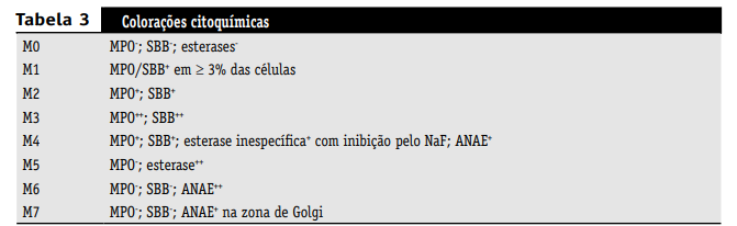 As colorações citoquímicas (Tabela 3) usadas no diagnóstico e na classificação das leucemias podem ser aplicadas tanto à medula óssea quanto ao sangue periférico, auxiliando na confirmação da origem mielóide e/ou monocítica. Apesar dos progressos da imunofenotipagem, as reações citoquímicas ainda são úteis no diagnóstico das LMA.
