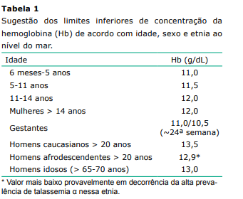 Os parâmetros da normalidade da concentração da Hb em crianças e em adolescentes também diferem daqueles observados nos adultos. Por exemplo, entre os 6 meses e os 5 anos, o limite inferior é de 11,0 g/dL; entre 6 e 11 anos, de 11,5 g/dL; entre 12 e 14 anos, de 12,0 g/dL, valor que se mantém para as mulheres a partir de então. Para os adolescentes do sexo masculino, o limite inferior é mais difícil de determinar diante da variabilidade dos níveis de testosterona para cada idade até o final da adolescência (Tabela 1).