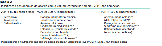 A anemia pode ser classificada em aguda e crônica, quanto ao tempo de instalação; decorrente da diminuição da produção (hipoproliferativa) ou do aumento da destruição dos eritrócitos (perda ou hemólise), quanto à causa e em normocítica/normocrômica, macrocítica e microcítica/hipocrômica, quanto ao volume corpuscular médio (VCM) (Tabela 2). Essa última maneira de classificar as anemias confere a vantagem prática de guiar o médico com respeito à investigação de sua causa, até porque, além do quadro clínico, o médico em geral dispõe, numa fase inicial, do hemograma, com os valores hematimétricos e as contagens de células das outras séries (leucócitos e plaquetas), o que também é útil para estabelecer o diagnóstico.