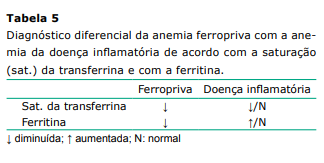 Outro diagnóstico diferencial é com a talassemia menor. Entretanto, essa condição não costuma acarretar queixas, e cursa com microcitose e hipocromia acentuadas, desproporcionais ao grau de anemia, que é leve, por causa da elevada concentração de hemácias, às vezes, acima da faixa da normalidade. Além disso, indivíduos com talassemia menor costumam ter níveis relativamente elevados (> 100 ng/mL) de ferritina sérica, com saturação normal ou pouco elevada da transferrina (Tabela 4). A medida do grau de anisocitose (RDW, do inglês red cell distribution width) em geral mostra valores dentro ou próximos da normalidade, o que não costuma ocorrer na AF, por exemplo.