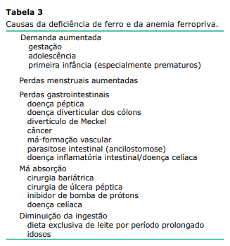 Causas de AF, ou de deficiência de ferro muito observadas nas duas últimas décadas são o uso prolongado de inibidores da bomba de prótons e a cirurgia bariátrica, que podem acarretar má absorção do ferro. Não é comum a deficiência por falta de ingestão desse metal, exceto em crianças em regime alimentar restrito ao leite por períodos prolongados, pois o leite é relativamente pobre em ferro. Em resumo, a AF é sempre decorrente de uma condição clínica subjacente, que deve ser investigada (Tabela 3).
