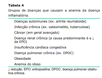 A anemia da doença inflamatória (ADI), também conhecida como anemia da doença crônica, é a segunda mais prevalente nos pacientes com anemia (a primeira é a anemia ferropriva) e a primeira em pacientes internados ou com doença crônica. A ADI ocorre em doenças que causam ativação imune e inflamação, tais como infecção crônica, doenças autoimunes e câncer. Mais recentemente, outras condições clínicas também foram identificadas como causadoras da ADI, como a doença renal crônica, a insuficiência cardíaca congestiva, a doença pulmonar crônica e a obesidade (Tabela 4).
