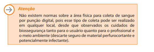 - Paredes lisas, resistentes e com divisórias constituídas de materiais lisos, duráveis, impermeáveis, laváveis e resistentes às soluções desinfetantes; Ambiente de coleta com ventilação natural ou artificial, com temperatura variando entre 20 e 26ºC para o conforto do usuário e dos profissionais de saúde;