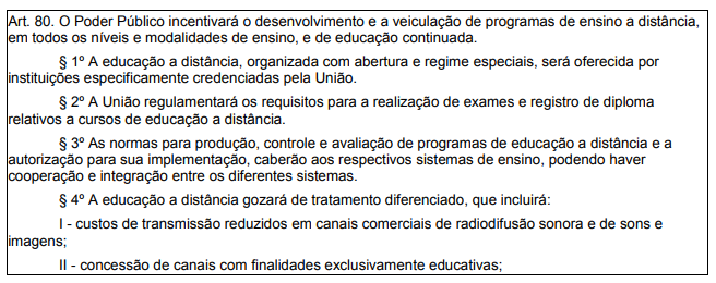 Este artigo da LDB foi regulamentado pelo Decreto nº 5.622, de 19 de dezembro de 2005 e normatizado por Portarias Ministeriais.