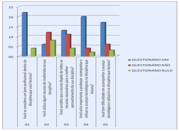 A maioria dos entrevistados se considera bons profissionais dentro da área que leciona, sendo que a maioria continua se utilizando de recursos mais tradicionais e que apesar da escola possuir recursos de multimídia, é pouco usado pelos professores, ou seja, não são explorados para um melhor aproveitamento da aprendizagem.