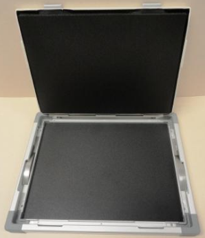Em alumínio e cantos em nylon de alto impacto. Com sistema de fechamento com travas tipo push, com áreas internas revestidas em espuma mantendo o perfeito contato entre filmes e ecrãs , proporcionando nitidez e qualidade de imagem.