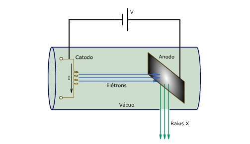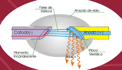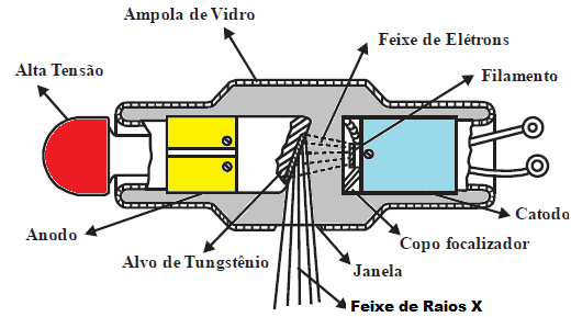 - O Cátodo (-) consiste em um filamento aquecido de tungstênio que proporciona a fonte de elétrons.