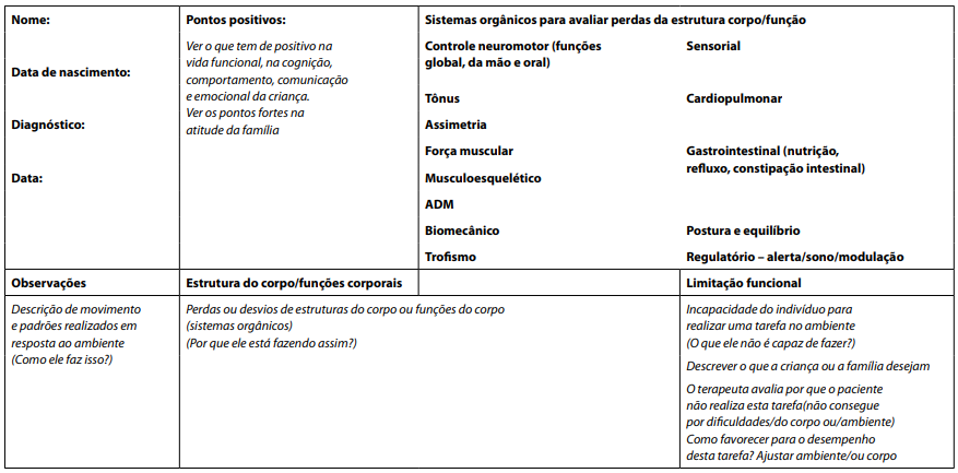 A avaliação funcional foi desenvolvida com base na Classificação Internacional de Funcionalidade (CIF). A identificação da restrição da participação exige uma comunicação efetiva com a criança, seus familiares e outros cuidadores.