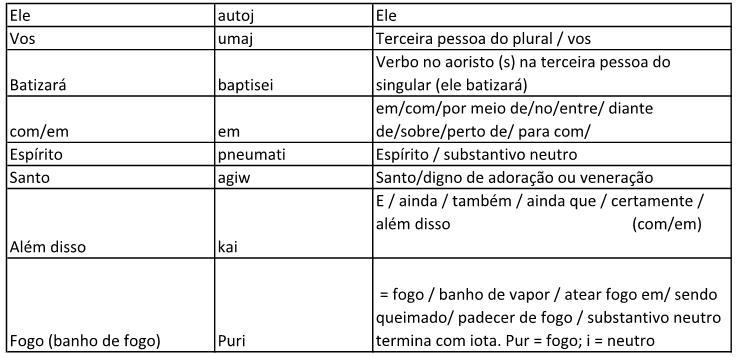 O versículo de Lucas (t. 4) e o de Mateus (t.5) são semelhantes. O texto objeto de nossa exegese (Mt 3.11.b) é igual ao lucano. {[(“...baptisei en pneumati agiw kai puri”), baptisei en pneumati aguiô kai puri], “...vos batizará com o Espírito Santo e com fogo”}.