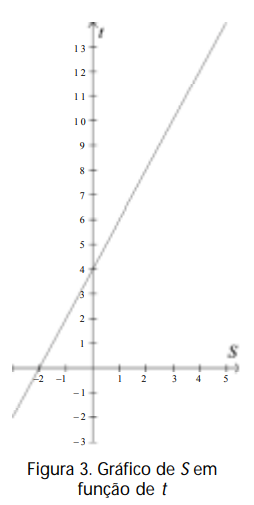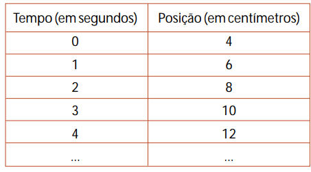 c) Fórmula algébrica: Chamando de t o tempo de percurso da formiga e de S sua posição, temos que para o valor t = 0 s, a formiga está na posição S = 4 cm. A cada segundo, somam-se 2 cm à sua posição. Assim, para t = 1 s, temos S = 2 + 4 = 6 cm. Para t = 2 s, temos S = 2 x 2 + 4 = 8 cm. Generalizando esse procedimento, vemos que a fórmula para o deslocamento da formiga é: