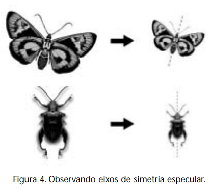 Encontramos vários exemplos de figuras simétricas na natureza. Muitos seres vivos têm uma configuração simétrica. Uma idéia de figuras simétricas é a encontrada nas gravuras abaixo. Se dobrarmos a folha de papel ao longo das retas tracejadas, a figura se sobrepõe. Estas retas são chamadas de eixos de simetria. Muitas vezes nem percebemos, mas há várias figuras simétricas na natureza. Veja os eixos de simetria indicados abaixo.