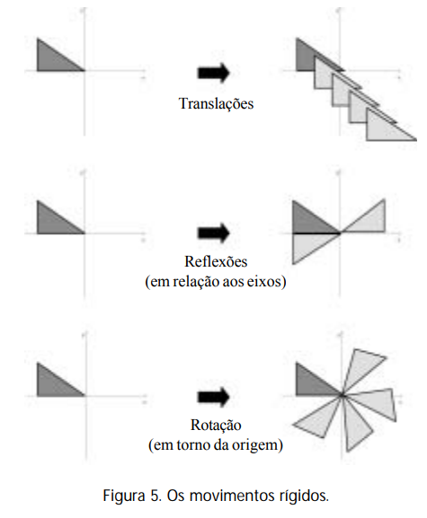 Por não distorcer as imagens, essas transformações são chamadas de movimentos rígidos no plano. As transformações isométricas de um plano são translação, reflexão e rotação, e todas as combinações entre esses movimentos. Translação é a transformação em que todos os pontos de uma figura se deslocam numa mesma direção, sentido e de uma mesma distância. Essa direção pode ser horizontal, vertical ou uma combinação delas. Reflexão em relação a alguma reta m, que pode ser chamada de eixo de reflexão ou de simetria, é a transformação que a cada ponto P associa o seu simétrico P’ em relação a m, isto é, m é a mediatriz do segmento PP’. Se dobrarmos a folha de papel ao longo de m, os pontos P e P’ se sobrepõe. Rotação é o giro da figura em torno de algum ponto e de um determinado ângulo. Veja exemplos de transformações sobre o desenho da figura abaixo: