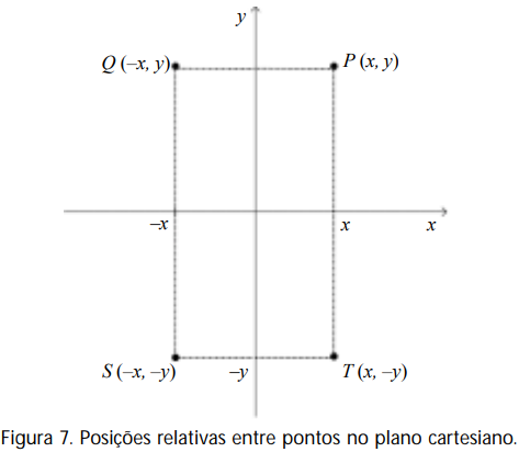 Os quatro quadrantes em que um plano cartesiano fica dividido por seus dois eixos oferecem várias oportunidades de aplicar a idéia de transformações a desenhos de funções. Para entender como funciona, vamos pensar em um ponto P representado por um par (x,y). Se os números x e y forem positivos não nulos, então o ponto está representado no primeiro quadrante. O que ocorre se tomarmos o ponto Q representado pelo par (-x,y)? O ponto terá a mesma ordenada y que o ponto P, mas vai ocupar o lugar simétrico ao ponto P em relação ao eixo y. Se tomarmos o ponto T (x,-y), esse ponto é simétrico a P em relação ao eixo x. Já um ponto S (-x,-y) está no terceiro quadrante.
