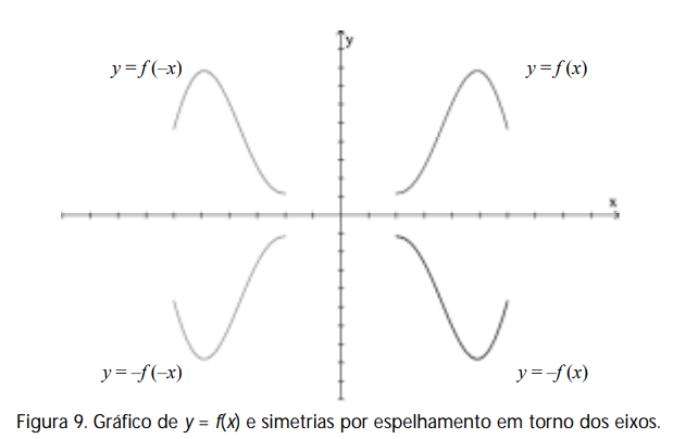 Estas mesmas relações podem ser empregadas quando fazemos algumas operações com a função ou com a variável independente. Se uma função f : R →R possui uma representação gráfica como segue, vejamos o que ocorre quando tomamos y = f (x), y = f (–x), y = –f (x), e y = –f (–x).