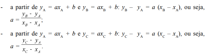 Seja A = (xA, yA) um ponto do gráfico, isto é, de yA = axA + b. Se B = (xB, yB) e C = (xC, yC) são outros dois pontos do gráfico não coincidentes e distintos de A, temos: yB = axB + b e yC = axC + b. É preciso observar que, em se tratando de três pontos distintos do gráfico de uma função, as abscissas de A, B e C são duas a duas distintas. Então, temos: