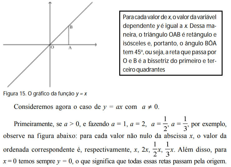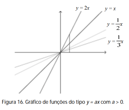 Dessa maneira, variando o coeficiente a > 0 em y = ax, observamos que o ângulo de inclinação da reta varia: se a > 1, o ângulo é maior que 45°; se 0 < a < 1, o ângulo é menor que 45°.