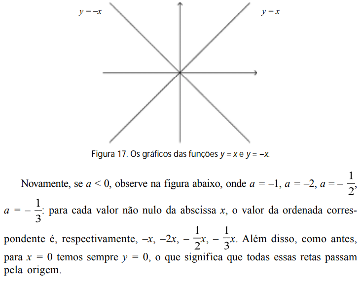 Dessa maneira, o coeficiente a < 0 em y = ax também faz mudar o ângulo de inclinação da reta: se a < –1, temos a reta numa posição mais próxima da vertical; se –1 < a < 0, a reta se encontra numa posição mais próxima da horizontal.