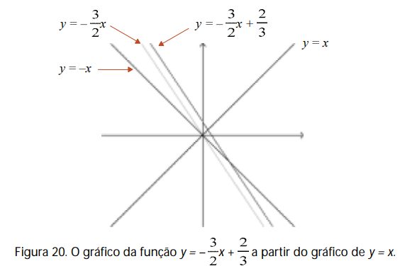 Assim, para obter o gráfico, por exemplo, da função y = – 3/2 x +2/3 , fazemos vários gráficos intermediários a fim de entender os movimentos ocorridos, a partir do gráfico de y = x.