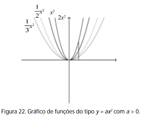 Além disso, para x = 0 temos sempre x = 0, o que significa que todas as curvas passam pela origem. Dessa maneira, o coeficiente a > 0 em y = ax2 faz mudar o ângulo de inclinação da curva2 : se a > 1, o ângulo aumenta (a parábola fica mais “fechada”), se 0 < a < 1, o ângulo diminui (a parábola fica mais “aberta”).