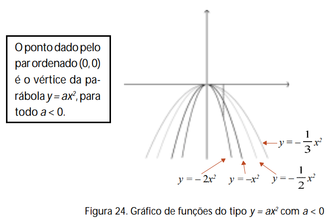 Além disso, como antes, para x = 0 temos sempre y = 0, o que significa que todas as curvas passam pela origem. Dessa maneira, o coeficiente a < 0 em y = ax2 , como antes, faz mudar o ângulo de inclinação da curva: se a < – 1, a parábola fica mais “fechada”, se –1 < a < 0, a parábola fica mais “aberta”.