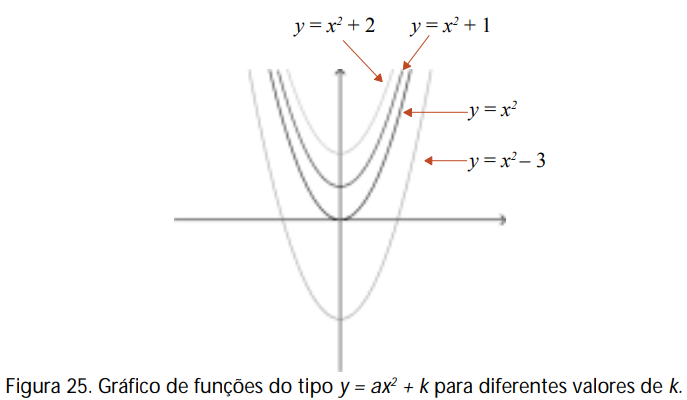 Vamos agora analisar o caso de funções do tipo y = ax2 + k, a ≠ 0. Para tanto, na figura abaixo estão os gráficos de funções desse tipo para alguns possíveis valores de k.