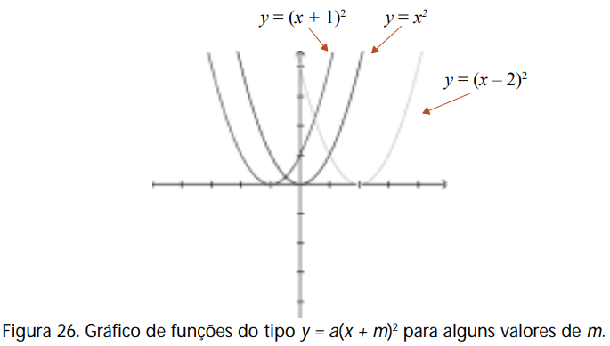 É preciso observar que em y = (x + 1)2 o valor x = –1 exerce o mesmo papel que x = 0 em y = x2 , que é o de zerar a variável dependente y. O mesmo acontece com x = 2 em y = (x – 2)2 . Uma análise relativa a todos os outros valores das abscissas nos mostram que o gráfico de y = (x + 1)2 sofreu uma translação horizontal de –1 unidade (isto é, de uma unidade para a esquerda), enquanto que o gráfico de y = (x – 2)2 sofreu uma translação horizontal de duas unidades (ou seja, de duas unidades para a direita) quando comparados ao gráfico da função mais simples y = x2 .