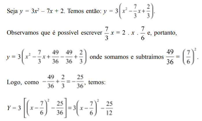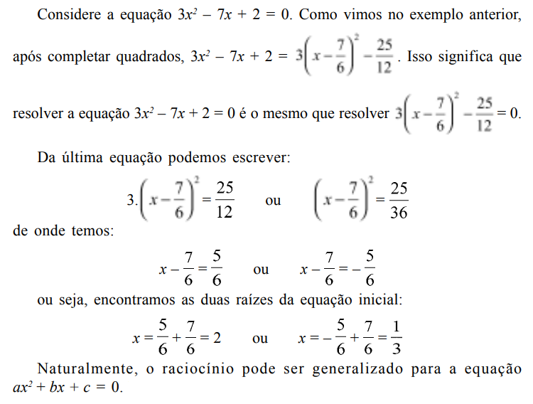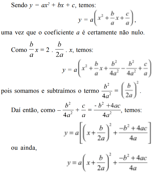 O processo desenvolvido é denominado completamento de quadrados, pois a grande questão foi a de obter o quadrado de uma soma ou de uma diferença. Completar quadrados é útil para escrever a expressão da função polinomial de segundo grau de maneira que a compreensão de seu gráfico a partir da função mais simples y = x2 seja imediata, facilitando, em particular, a determinação das coordenadas do vértice da parábola, evitando a necessidade de decorar fórmulas. A fim de resolver o problema geral colocado, precisamos fazer o mesmo cálculo, mas de maneira formal, com coeficientes literais.