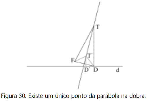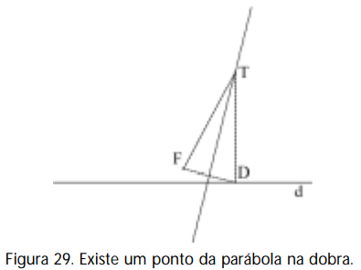 Basta observar que a “dobra” é a mediatriz do segmento FD6 e o ponto T é a intersecção da dobra com a perpendicular a d pelo ponto D. Sendo assim, pela congruência dos dois triângulos determinados, concluímos que os segmentos TF e TD são congruentes, logo T pertence à parábola.