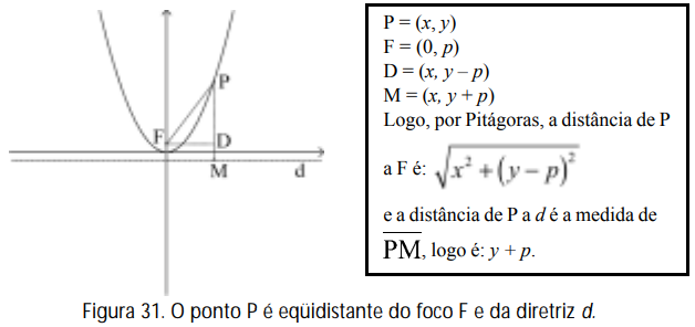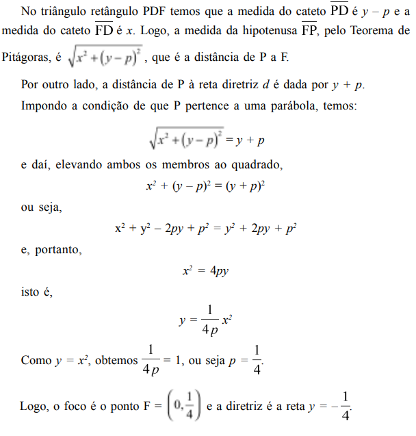 Uma vez que o vértice da curva é o ponto O = (0, 0) – não esqueça que o vértice, sendo um ponto da curva, precisa satisfazer a propriedade que caracteriza a parábola – a fim de determinar o foco e a diretriz, vamos procurar um ponto F = (0, p) e uma reta y = – p, pois dessa forma a distância de O a essa reta é p, e a distância de O a F também é p. O parâmetro p precisa ser determinado a fim de encontrar F e d. Para tanto, vamos impor a condição: a distância de qualquer ponto P = (x, y) da curva ao ponto F seja a mesma do que a distância do ponto P à reta diretriz d.