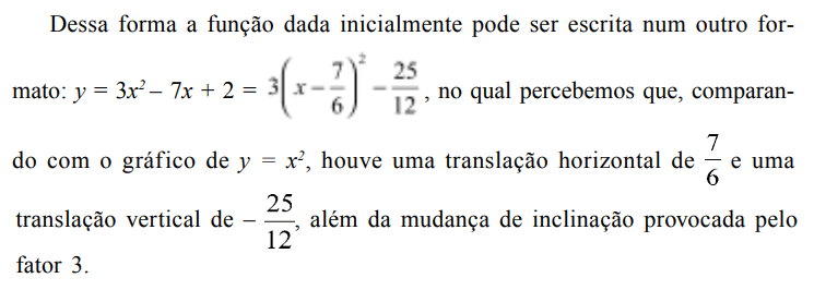 É bom observar que as coordenadas do vértice estão automaticamente determinadas na última expressão escrita, além de estarem claramente explícitas as translações horizontal e vertical e a mudança de inclinação em relação ao gráfico da função mais simples y = x2 . Além disso, nessa última expressão é possível perceber a maneira pela qual se relacionam a, m e k com a, b e c, conforme havíamos anunciado. Escreva a, m e k em função de a, b e c.