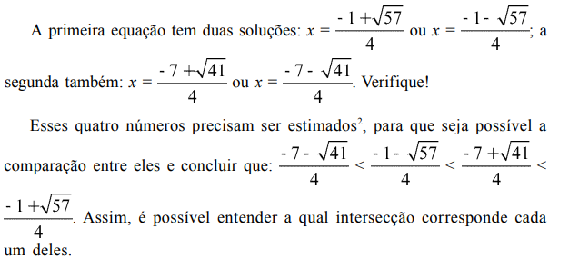 A fim de resolver a inequação |3x + 4| < |2x2 + 4x – 3|, vamos inicialmente determinar as intersecções dos dois gráficos. Embora nem todas estejam visíveis na figura, precisamos investigar a ocorrência de intersecções em:
