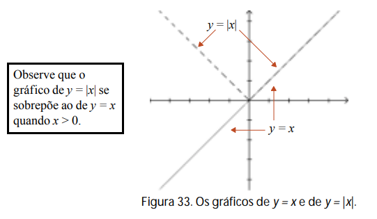 Com efeito, para os valores positivos ou zero da variável independente x, o valor da variável dependente y é o mesmo que x, pois y = x; para valores negativos de x o valor de y é –x, pois y = –x. Dessa forma, o gráfico é formado por duas semi-retas de mesma origem. Outra maneira interessante de olhar para o gráfico de y = |x| é considerar que ele coincide com a reta y = x para valores de x positivos ou zero, enquanto para valores negativos de x, tomamos a semi-reta “rebatida”, pois, nesse caso, |x| = – x. Esta semi-reta “rebatida”, evidentemente, é simétrica à original em relação ao eixo horizontal.