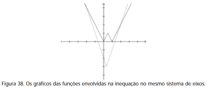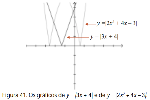 Como é preciso que |3x + 4| < |2x2 + 4x – 3|, estamos buscando os valores de x para os quais o gráfico de y = |3x + 4| fica abaixo do gráfico de y = |2x2 + 4x – 3|.