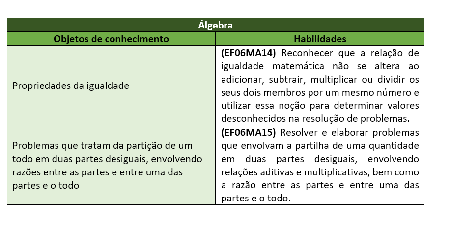 Para o desenvolvimento das habilidades previstas para o Ensino Fundamental – Anos Finais, é imprescindível levar em consideração as experiências e os conhecimentos matemáticos já vivenciados pelos alunos, criando circunstâncias nas quais possam fazer observações sistemáticas de aspectos quantitativos e qualitativos da realidade, estabelecendo inter-relações entre eles e desenvolvendo ideias mais complexas. Essas situações precisam articular múltiplos aspectos dos diferentes conteúdos, visando ao desenvolvimento das ideias fundamentais da matemática, como equivalência, ordem, proporcionalidade, variação e interdependência.