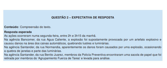 En las primeras horas de este lunes se registraron explosiones en dos sucursales bancarias de la delegación Iztacalco y Benito Juárez, que provocaron sólo daños materiales, sin que dejaran personas lesionadas. De acuerdo con reportes policiales, el primer incidente tuvo lugar a las 02:00 horas de este lunes en una sucursal Bancomer, ubicada en el cruce de la calle Agua Caliente y calzada Ignacio Zaragoza de la colonia Pantitlán, Iztacalco. En este lugar, la explosión presuntamente provocada por un artefacto, dejó daños en el área de cajeros automáticos, rompiendo plafones y cristales. Veinte minutos después, en una sucursal del banco Santander, ubicada en la esquina de la calle Normandía y la calzada de Tlalpan, en la colonia Zacahuitzco, de la delegación Benito Juárez, se registró otra explosión. Esta también provocó daños al interior de la sucursal, al parecer por un artefacto que estalló, lo que ocasionó que algunas de sus ventanas se rompieran y parte del plafón se viniera abajo. Por último, a las 03:15 horas, elementos de la Policía Preventiva hallaron una bolsa de papel al interior de otra sucursal Santander, ubicada en el cruce de la calle Benito Juárez con la calzada de Tlalpan en la colonia Albert, de la misma demarcación. Elementos del Agrupamiento Fuerza de Tarea llegaron al lugar para sacar el objeto presuntamente explosivo y fue llevado a sus instalaciones, en la delegación Tláhuac, para ser analizado. (Disponível em: . Acesso em: 5 set. 2011.)