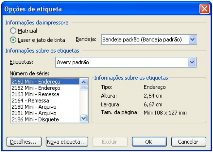 - Iniciar com base em um documento existente. Selecione a primeira opção e clique, no meio da tela em opções de etiqueta. A caixa a seguir será aberta: