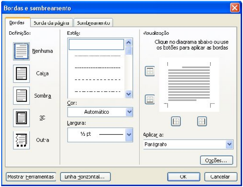 Selecione o texto desejado. Clique no botão Bordas (na seta ao lado) e escolha a borda desejada.Para escolher um tipo diferente de linha, escolher uma cor, espessuras e um sombreamento, clique no menu Formatar/Bordas e sombreamento. A caixa a seguir será aberta: Em Bordas você escolhe uma borda para o texto. Escolha em Aplicar a entre as opções Parágrafo (linha ou parágrafo inteiro) ou Texto (somente a palavra selecionada). Em Borda da página, escolha uma borda para colocar na folha inteira do documento, em todas as páginas. Clique em Arte para visualizar mais bordas. Em Sombreamento, escolha uma cor para colocar no parágrafo ou texto. Confirme com OK.