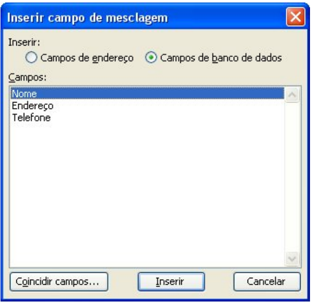 Clique sobre o campo desejado. Depois clique no botão Inserir. O campo será inserido no local especificado. Feche a caixa para posicionar o cursor em outro local na carta. Clique novamente no botão Inserir campos de mesclagem. Siga o mesmo processo para inserir todos os campos na carta.