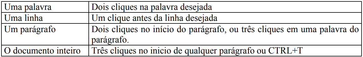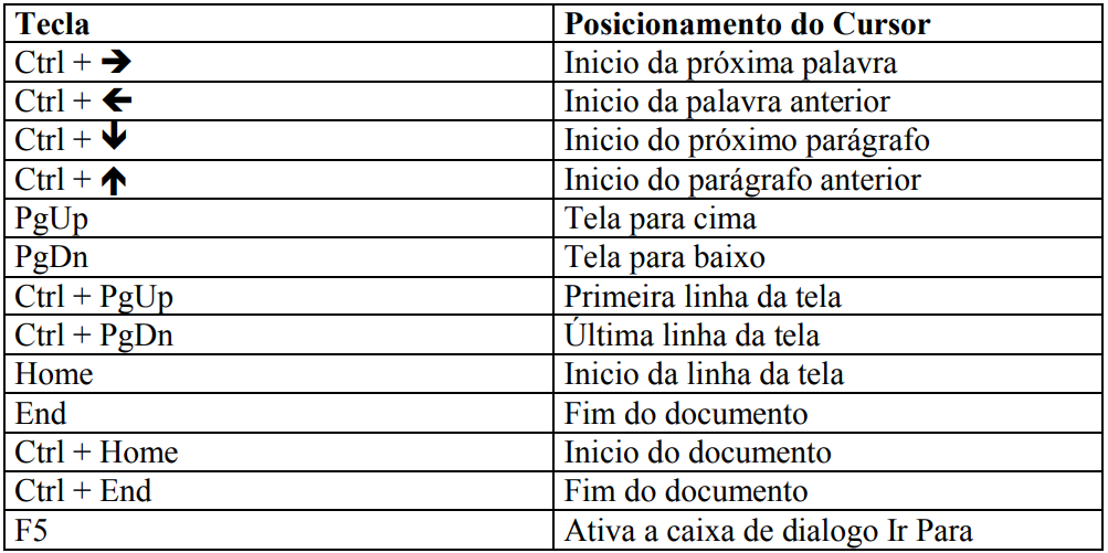 Às vezes, você deseja movimentar-se pelo documento, principalmente quando o mesmo é bem extenso, é fundamental, uma das formas de se movimentar é usando o mouse, mas existe uma série de atalhos de movimentação através do teclado que veremos a seguir: